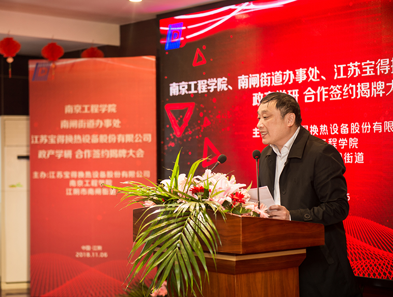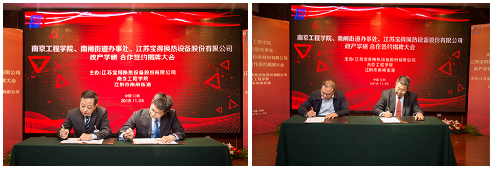 11月6日上午,我校与江阴市南闸街道、江苏宝得换热设备股份有限公司政产学研合作签约揭牌仪式在宝得公司举行。